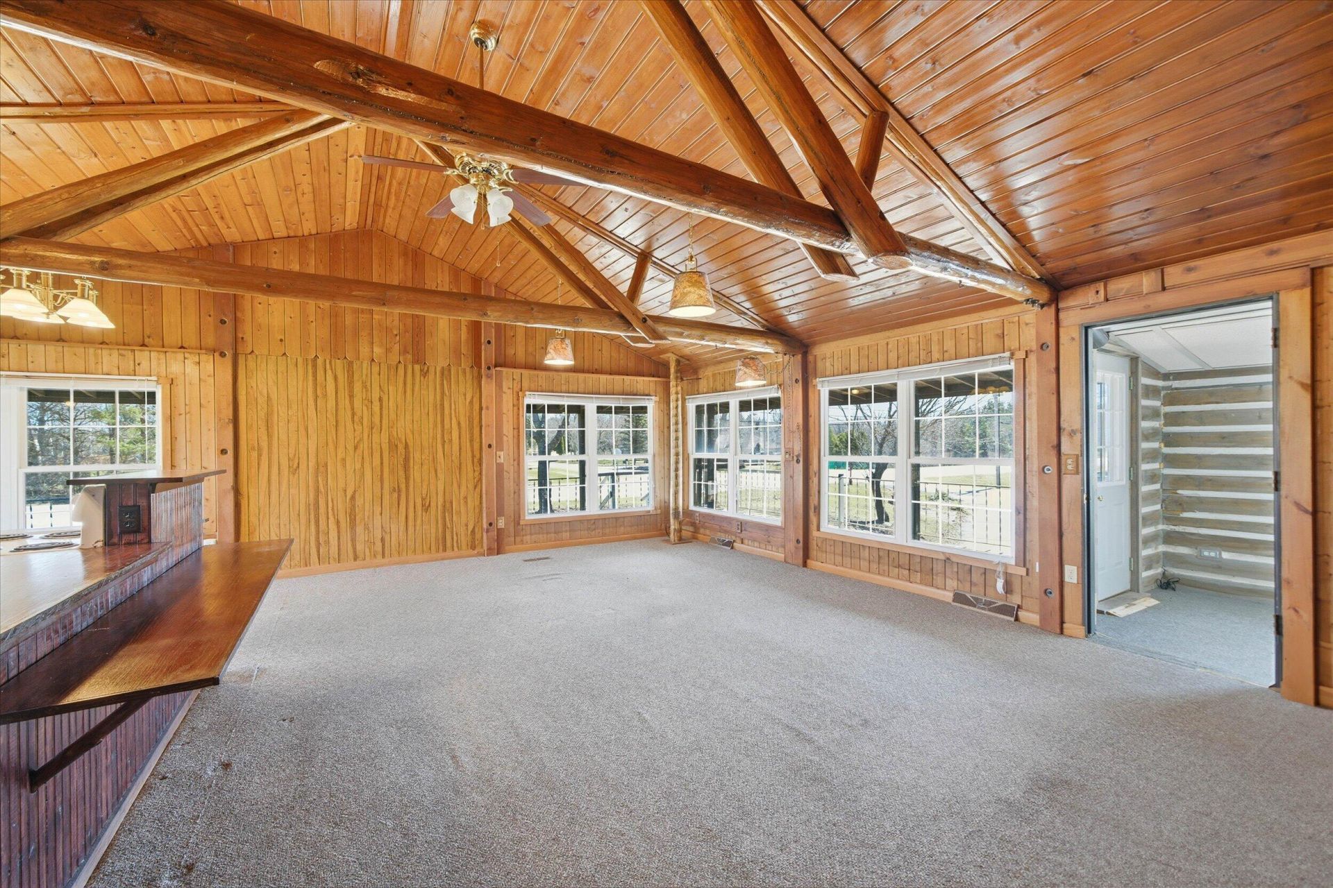 Nestled against a backdrop of Holy Hill and the rolling hills of Erin! This Alpine inspired log home is a master class of traditional craftsmanship and enduring stability. Original owner is a descendant of the German masons who built Holy Hill, the Fox n Hounds and log homes in the Holy Hill area. Beautiful open concept with soaring timber framed cathedral ceiling. Hardwood maple floors throughout. Open staircase. Updated windows, furnace is approx 10yrs, water heater 7 yrs,. A spacious wrap around deck. Outbuildings include a masonry block 2 car detached garage, a large barn, with work shop and a garden shed. All buildings have metal roofing. Plenty of space for gardening or hobbies.