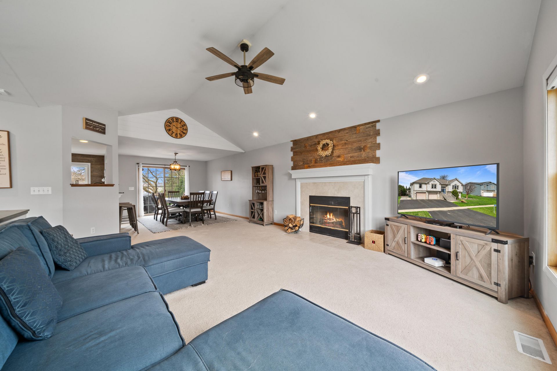 Remarkable 4BD, 3BA home in Whispering Trails! This beautifully maintained home features vaulted ceilings and an abundance of natural sunlight throughout, along with a spacious open-concept layout. The eat-in kitchen flows seamlessly into the dining area. Sliding doors lead to one of the back decks, creating a great indoor-outdoor connection. The living room showcases a cozy gas/wood-burning FP. The primary suite features a walk-in closet, and a whirlpool tub. The finished LL includes a 4th BD, full bath, and family rm w walkout access to the patio. Add'l highlights include a finished and insulated 2.5-car garage and storage shed. Step outside to enjoy gorgeous, private landscaping and your own backyard oasis--complete with a heated pool and custom deck, ideal for summer entertaining,