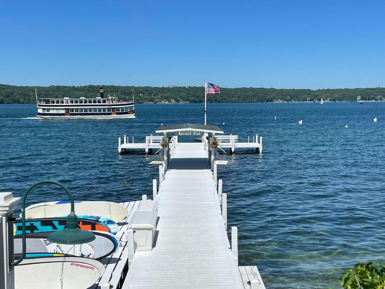 Harvard Club Cottage R views lake, park & flower gardens- Includes 26ft deep water boat slip! Home was completely renovated in 2014 to include modern conveniences- water with reverse osmosis & heat all year around- a rare find in this club!! Boasts open layout, wood floors throughout, living room with fireplace & built in shelves, kitchen with SS appl, center island & granite tops. Baths include granite double vanities. Relax on the front porch- Enjoy 3.6 acres & 240ft frontage- Step into a time where the pace of life seems to slow, senses sharpen to hear birds singing & sounds of the lake- Where a jump into crystal clear water restores mind & body- That's Harvard Club Life- A 150 Year Legacy! Transfer is by membership, bill of sale & cash closing- Dues include landscaping
