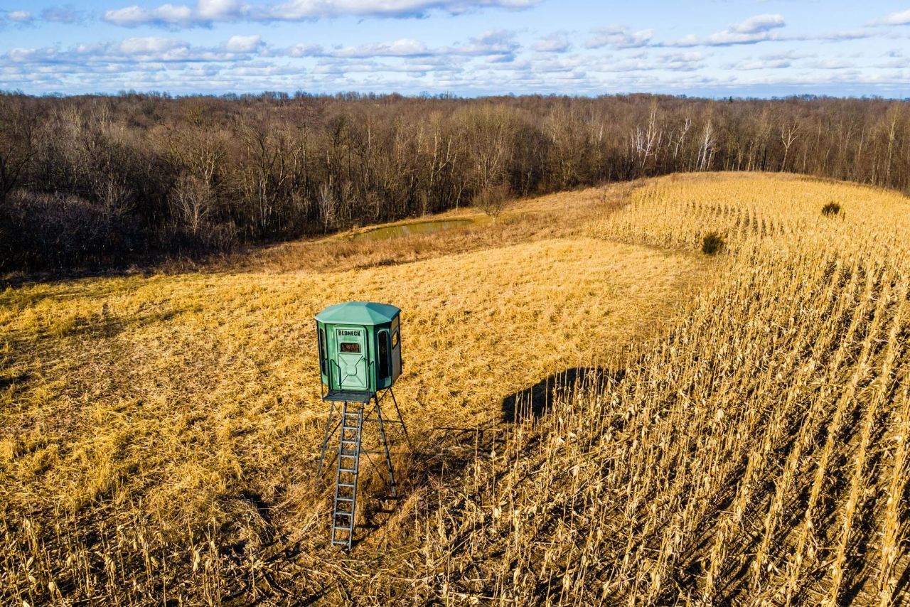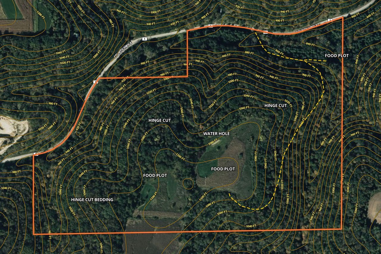 Serious whitetail hunters will recognize what this 86-acre Driftless property offers the moment they step on it. The entrance from County Rd S follows a pine edge into a narrow hollow funnel and small food plot. From there, a wide ridge road leads to the property's highlight feature. Two open fields are set up with green to grain food plots and Redneck box blinds. Approximately 4 acres of plots are established, with room to expand. Food sources include clover, brassicas, standing corn, and apple trees for season-long attraction. A water hole sits tight to cover on the north side of the east field. Hinge-cut bedding keeps deer close yet far enough away to allow low-impact access. Take a look through the trail cam photos and you'll see a well documented history of quality whitetails.