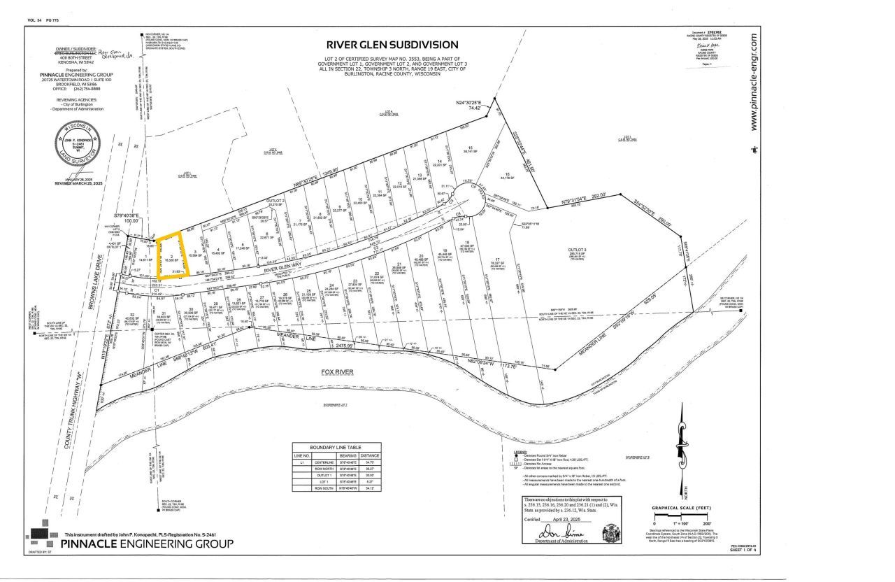 Introducing River Glen! Nestled in the quaint and charming town of Burlington, this brand-new community by Bear Homes offers 32 desirable homesites along the scenic Fox River. With the convenience of municipal water and sewer, you can bring your vision to life and build your dream home with the builder of your choice. Don't miss the chance to be among the first to secure your spot in this fabulous new neighborhood!