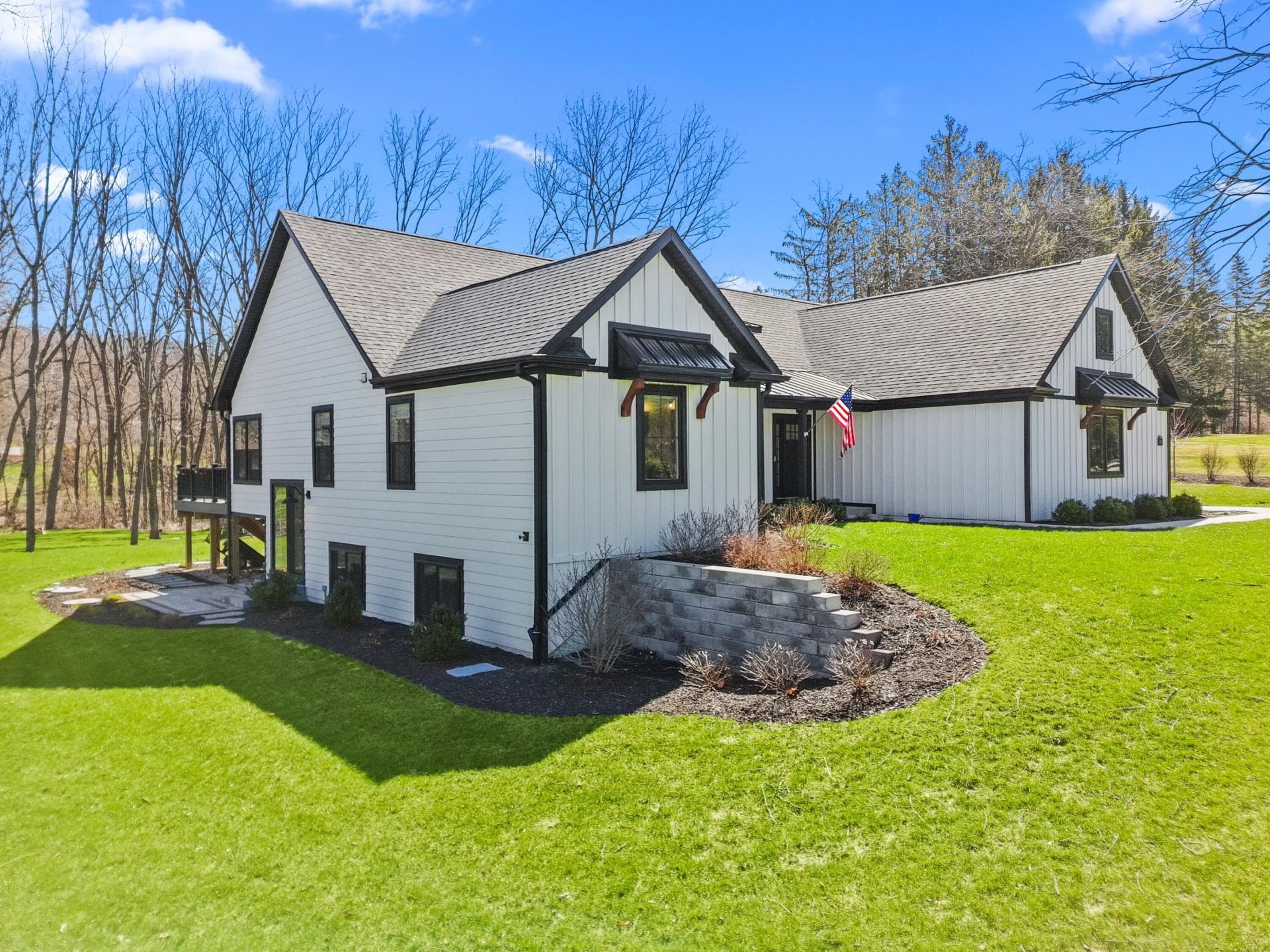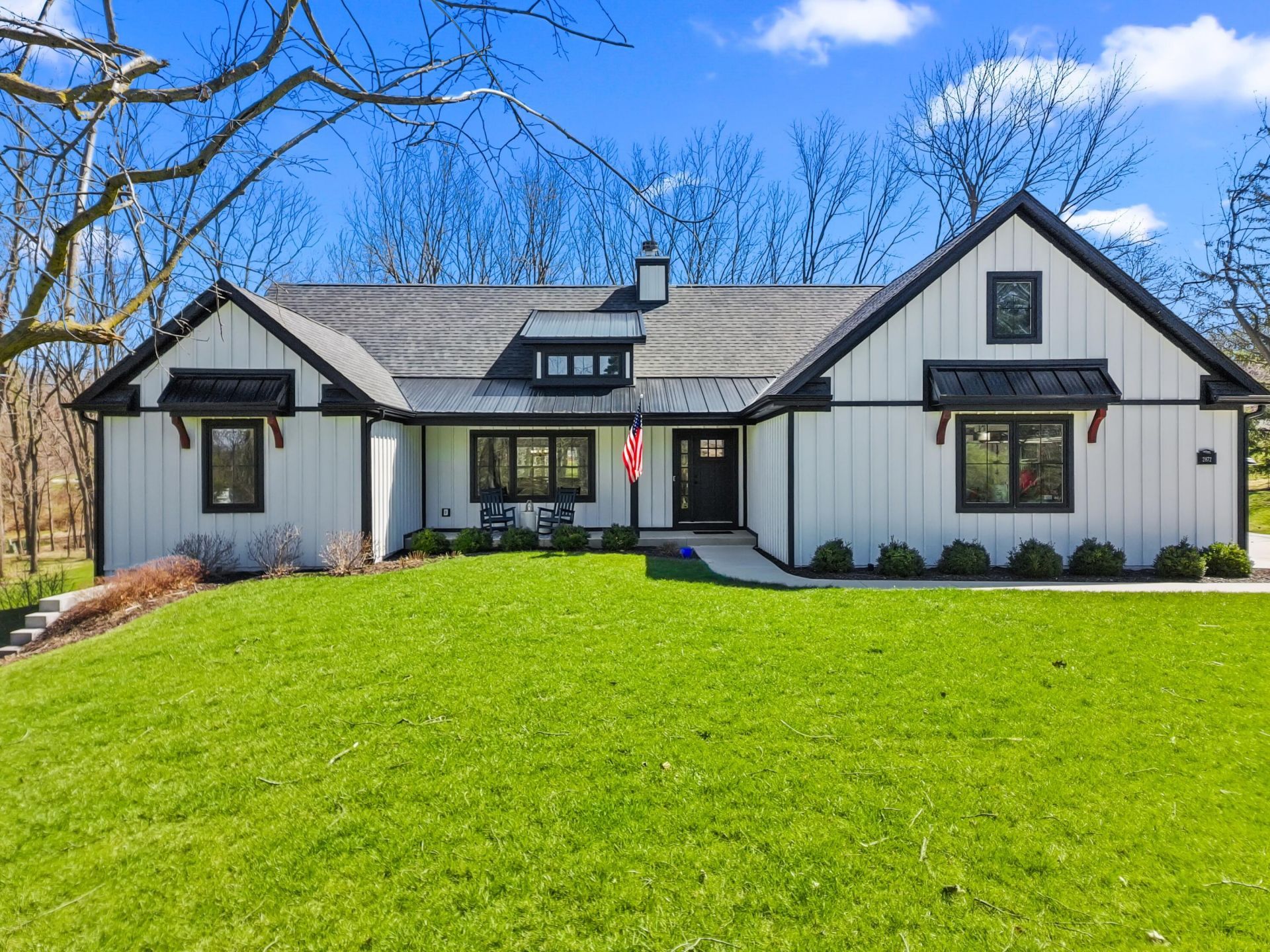 From every angle, you will find this 4-year old, 5-bedroom, 3-bathroom modern farm ranch-style home fascination. Amenities include vaulted ceilings, modern kitchen, fireplace, two porches, deck, two-car heated garage, and a large stone patio with a fire pit. Located on a 1+ acre lot only minutes from Lake Geneva and the popular Woods school district.