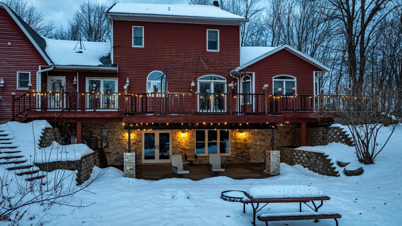 Stunning custom home blending country charm with modern comfort on 22+- acres. The inviting red barn-style exterior opens to warm, elegant interiors featuring a grand stone fireplace. Entertain with ease in the impressive Tuscan inspired lower level complete with a full bar, fully furnished game room, and wine cellar. The main level offers a beautiful kitchen, cozy coffee nook, and walkout to a spacious deck with covered gazebo overlooking peaceful wooded views. The primary suite, also on the mail level, includes a spa-inspired bath with dual sinks and glass-block shower. A separate suite is included above the garage where your guests can enjoy privacy and comfort . A rare find offering style, craftsmanship, and serene privacy.